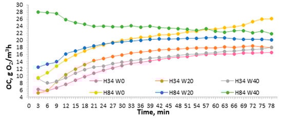 Oxygenation capacity (OC) determines the amount of oxygen introduced into the liquid in kg O2/m3∙h at the initial oxygen deficit (Equation (1)).