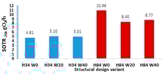 The standard oxygen transfer rate (SOTR) was calculated based on Equation (3) in relation to standard conditions (temperature 20 °C). Values of temperature T and pressure Pb under measurement conditions were used in Equations (3) and (4).