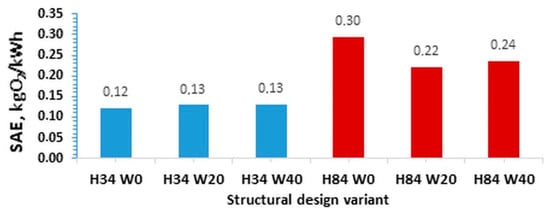 The standard aeration efficiency (SAE) was determined for each variant of pipe nozzle position H and moving bed filling W (Equation (8)). The liquid volume in the aeration chamber VL for pipe nozzle position H34 was 0.660 m3, while that for H84 was 0.974 m3. The energy consumption by two blowers feeding the reactor was 2 × 45 = 90 W.