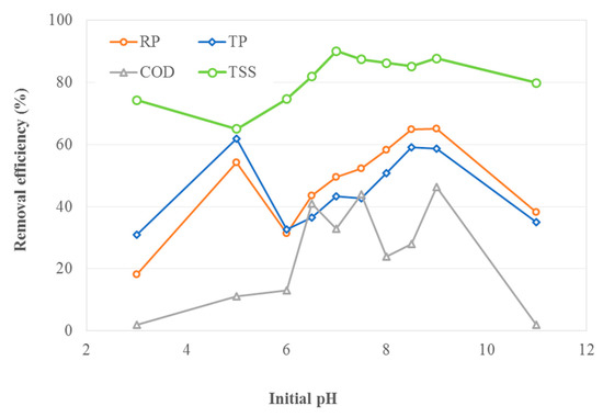 In order to investigate the effect of initial pH on EC performance, the brewery wastewater samples were adjusted to the desired pH and tested at 5 W applied power and 20 min electrolysis time. The results are shown in Figure 2.