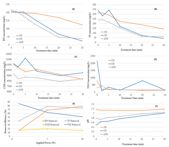 Effect of applied power on electrocoagulation (EC) performance. (A) Reactive phosphorous (RP) concentration vs. treatment time, (B) Total phosphorous (TP) concentration vs. treatment time, (C) Chemical oxygen demand (COD) concentration vs. treatment time, (D) Total suspended solid (TSS) concentration vs. treatment time, (E) removal efficiencies vs. applied power at 20-min treatment time, (F) pH of solution vs. treatment time.