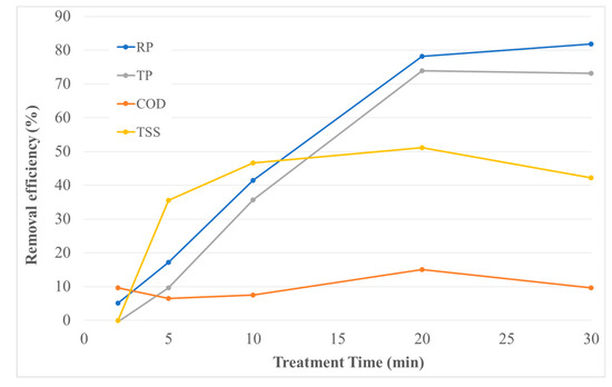 Increasing the applied power from 5 W to 10 W for a 20-min treatment time did not significantly improve the removal of nutrients and COD, indicating that at an applied power of 5 W, the majority of the particulate matter was capable of being destabilized. Based on the experimental results obtained, the optimum applied power was chosen to be 5 W for a 20-min treatment time that resulted in RP, TP and COD removal percentages of 69%, 78% and 20%, respectively.