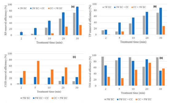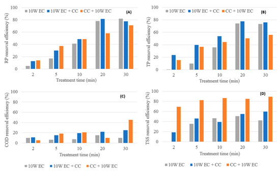 Comparison of removal performance of EC, EC-CC and CC-EC (10 W); (A) RP removal performance, (B) TP removal performance, (C) COD removal performance, (D) TSS removal performance (supernatant).