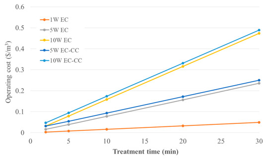 To calculate the operating costs of treatment, Equation (3) was applied. The cost of aluminum sulfate was estimated at $0.53 per kg and for the consumed Al electrodes at $2.25 per kg [16]. The cost of electricity obtained from the Ontario Energy Board [24] for Guelph, Ontario was estimated at $0.094 per kWh, which assumes a mid-peak time-of-use price period. The dry sludge disposal cost was ignored due to the experiments being conducted at laboratory-scale [25]. The electrode and energy consumption were calculated using Equations (1) and (2). A comparison of operating costs for EC and EC-CC at 1 W, 5 W and 10 W, as a function of treatment time, is shown in Figure 7.