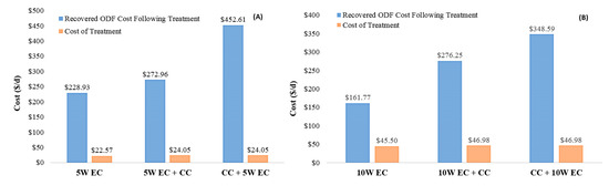 Comparison of recovered ODF cost following treatment and cost of treatment (30-min treatment time). (A) At 5 W applied power. (B) At 10 W applied power.