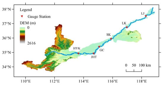 Sketch map of the locations of gauge stations in the LYR used in this study.