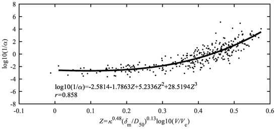 The calibration data are used to determine the coefficients b1 and b2. b1 and b2 are determined via the following steps: (1) calculate , and using Equations (7), (8) and (4), respectively; (2) manually set the values of b1 and b2, and calculate Z using Equation (9); (3) calculate (1/) by Equation (1); (4) conduct a third-order polynomial curve fitting between (1/α) and Z (Z > 0) and obtain the empirical equation of the relationship between (1/α) and Z; and (5) choose the b1 and b2 values that give the best fitting result. Notably, we mainly focus on the flow resistance law under a movable bed; thus, we only select the data samples of calibration data with the calculated Vc smaller than V. In the actual calculation process, a grid search strategy is used to select b1 and b2, with values ranging from −2 and 2 at an increment of 0.01, and 401 × 401 relationships between log10(1/α) and Z are obtained. From all of the experiments, b1 = 0.48 and b2 = 0.13 are found to give the best result; thus, Equation (9) can be expressed as follows:
