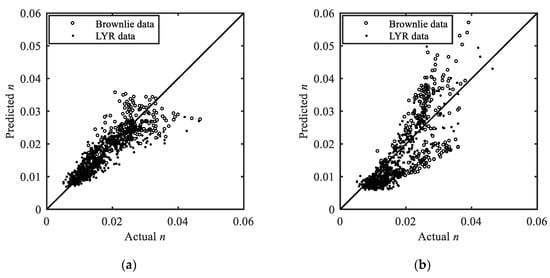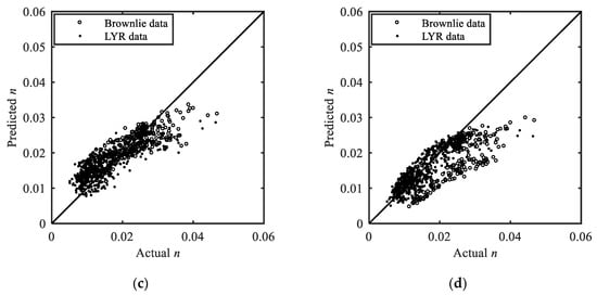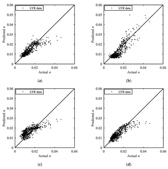 Predicted n plotted against actual n with the LYR validation data: (a) The proposed Equation (11); (b) Zhao-Zhang equation; (c) Wu-Wang equation; (d) Ma-Xia equation.
