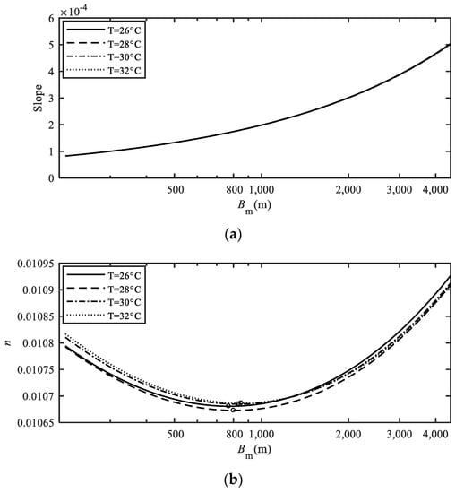 Based on these steps, the Bm~J and Bm~n relations are obtained (Figure 5). As shown in Figure 5a, the slope monotonically increases with the main channel width. However, as shown in Figure 5b, n decreases first and then increases; thus, a critical point (minimum point) of n can be found in each line in Figure 5b. Sha and Jiang [42] studied the eco-erosion problem of very shallow flow on a slope surface and revealed that the evolution of the flow path follows the maximum entropy principle of thermodynamics, indicating that water flow tends to reach a morphology of a plane and section with minimum resistance. Li et al. [43] investigated the development patterns of sand bars in alluvial rivers and believed that the plane morphology of sand bars always tends to reach the minimum resistance to ensure morphological stability under the given flow, sediment and boundary conditions. In this study, following the concept of minimum resistance, it is speculated that the ratio of the energy consumed by resistance to the total energy is the smallest and that the sediment transport efficiency reaches a maximum when n reaches the critical value under the same flow discharge, sediment concentration, particle size and water temperature conditions. We regard the main channel width under the critical n as the stable main channel width and define it as the optimum main channel width for sediment transportation Bm_optimum. As shown in Table 6, Bm_optimum is 770 m, 800 m, 830 m and 850 m when the water temperature is 26 °C, 28 °C, 30 °C and 32 °C, respectively. Different channel width results under the same flow discharge (4000 m3/s) were obtained by previous researchers using various methods. Jiang et al. [44] plotted the relation between the flow discharge and stable main channel width, and found that the stable main channel width was about 600 m in the LYR. Ma and Liu [45] obtained the design channel widths at HYK (1080 m) and GC (806 m) by hydraulic computations. Xu [46] found that the stable main channel width ranges from 500 m to 1000 m in the LYR through the combination of flow resistance equation, sediment transport equation and regime equation. Ma [47] discovered that the stable main channel widths range from 580 m to 987 m when the sediment concentrations were 30~120 kg/m3. Ma [11] asserted that the optimum main channel width is 360~460 m in the LYR. We find that the stable main channel widths calculated by this study basically match the existing results except for the result obtained by Ma [11], which is smaller than other results. This finding is consistent with the current river training width in the LYR (1000 m from HYK to GC [48]). The determination of the stable main channel width is crucial in the determination of the river training width and the strategy for the LYR. Due to the importance of this issue, the determination of the width needs to be carefully argued by different methods, as done by [11,44,45,46,47]. This study provides an alternative approach for theoretically estimating the optimum main channel width (stable main channel width) for the river training strategy for the LYR.