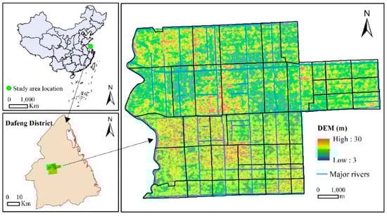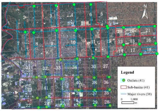 The study area is a typical urbanized basin that covers an area of approximately 74.6 km2 with a permanent population of about 185 thousand, of which has nearly 82.9% were urban residents in 2019. This area includes the urban area of Dafeng District and its surrounding suburbs, which border the Yellow Sea to the east (Figure 1). The terrain is very flat; the elevation is relatively high, at 10.24 m, in the south and relatively low, at 8.79 m, in the north. The soil types in the study area are all moist soil, and most rivers have been channelized. According to the land use data in 2018 (Figure 2), the proportion of urban area (including urban land and highway) in the study area was 27.5%, while rural areas (including rural land and rural road) accounted for 19.5%, cultivated field (including irrigated land and paddy field) accounted for 30.5%, and other land use types accounted for 22.5%. The climate of this area, which is suitable for the growth of thermophilic crops, belongs to the transition zone between the subtropical and warm temperate zones. According to data acquired in the last 60 years, the average annual rainfall is 1075 mm, and the average annual evaporation was approximately 800 mm. The precipitation from June to September accounts for 63% of the precipitation throughout the whole year. In 2017, the average annual temperature was 15.7 °C, the daily maximum temperature was 38.6 °C and the daily minimum temperature was −6.8 °C. A true-colour image showing the distribution of sub-basins is provided in Figure 3.