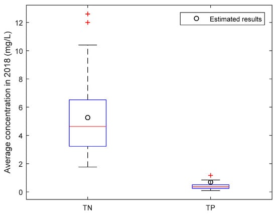In the study area, the annual local water volume and the annual external water supply in 2018 were 4.71 × 107 m3 and 4.21 × 106 m3, respectively. Based on the data and the results of all pollution loads emission into rivers, we estimated that the annual average of TN and TP concentration were 5.27 mg L−1 and 0.70 mg L−1, respectively, in 2018. These estimated TN and TP concentrations were between the measured values and slightly above the median (Figure 5), and hence the estimated concentrations were considered reasonable.
