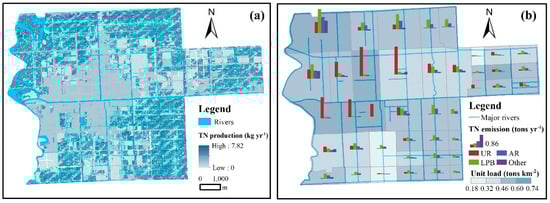 Annual average NPS TN load production per grid (a) and emissions into the river in each sub-basin (b).