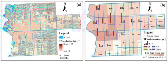 The NPS TP production per grid and emissions into the river each sub-basin are shown in Figure 8a,b. The TP production intensity was prominent in ponds and some farmland grids. The maximum value was 2.57 kg year−1 for a 30 × 30 m grid—that is, 2.85 tons km−2 year−1. The total TP emissions and unit load for the north-western sub-basins were both higher than those of the other sub-basins. UR accounted for the largest proportion among these sub-basins. Aquaculture had relatively large impacts on sub-basins 2 and 7.