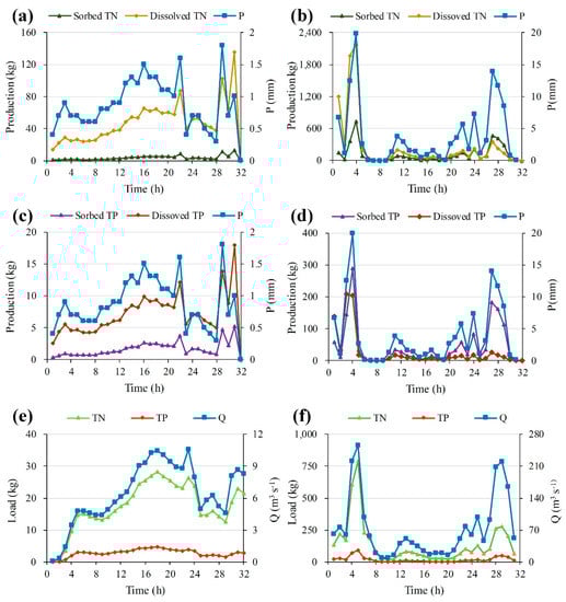Pollution generation (a–d) and emission (e,f) processes for two rainfall events. (a,c,e) took place from 14:00 on January 3 to 21:00 on 4 January 2018. (b,d,f) took place from 12:00 on 5 May to 19:00 on 6 May 2018.
