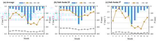Figure 11 shows the monthly average concentrations of the NPS TN and TP emissions into rivers in each sub-basin without considering point and internal sources. The area-averaged concentrations of TN and TP were relatively low from July to October. The maximum concentrations of TN and TP were 1.24 mg L−1 and 0.19 mg L−1, respectively (Figure 11a). Sub-basins 33 and 37 represented the concentrations of typical urban area and farmland, respectively (Figure 11b,c). The monthly magnitude and its variation in the concentration of farmland were both higher than that of urban area. The typical farmland was characterized by a poorer water quality from February to April and a better water quality from July to October. This phenomenon was related to the pollution caused by livestock and poultry breeding in the farmland sub-basin.