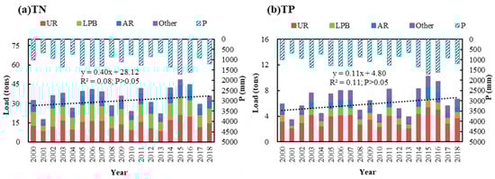 (2) The variations in the monthly and interannual TN and TP loadings were consistent with the variations in rainfall. The emissions of TN and TP accounted for 56.2% and 58.0%, respectively, of the total in summer;