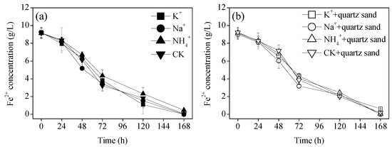 In general, the formation of secondary iron minerals can be roughly divided into three steps: Fe2+ is oxidized to Fe3+; Fe3+ is hydrolyzed and forms mineral crystal nucleus, and the nucleus gradually agglomerates and expands [19]. The synthesis of secondary iron minerals involves new phase formation, so the existence of an induction period can lower the initial precipitation efficiency of Fe3+ [20]. Numerous studies have confirmed that the existence of crystal seeds provide nucleation sites for mineral formation, eliminating the induction period and accelerating initial precipitation efficiency [20,21,22]. For example, Dutrizac found that the addition of crystal seeds (sodium, ammonium, and potassium jarosites) can accelerate the hydrolysis and mineralization of Fe3+ and raise the mineral output [20]. However, these results were based on chemical methods, mainly investigating the effect of crystal seeds on the synthesis of jarosite at high temperatures (60–100 °C). Few reports regarding the application of crystal seeds in the biosynthesis of jarosite by A. ferrooxidans have been published, except for that of Wang et al. [23] who used quartz sand as a crystal seed to form K-jarosite in a FeSO4–K2SO4–A. ferrooxidans system. In addition, members of our team have investigated the influence of quartz sand on secondary iron mineral formation by biomineralization in municipal sludge filtrate mixture systems (including K+, Na+, and NH4+), the results showed that 10 g/L quartz sand can induce and promote K-jarosite formation when the concentration of Fe2+ is 4–8 g/L, but Na-jarosite and NH4-jarosite were not detected in the collected minerals [24]. Previous studies have shown that quartz sand can promote the transformation of soluble Fe to jarosite in acid sulfate environment. Nevertheless, it is still unclear how quartz sand impacts the efficiency of Fe2+ oxidation and total Fe precipitation in A. ferrooxidans culture solutions, including K+, Na+, or NH4+. In previous studies, only the influence of K+ concentration has been taken into account [23], and the relative mineralizing ability of K+, NH4+, or Na+, the differences in mineral phases between the secondary iron minerals in the presence of quartz sand, have not yet been reported. The study on the influence of quartz sand on the ability of monovalent cation biomineralization has certain reference significance for the biological treatment of AMD.
