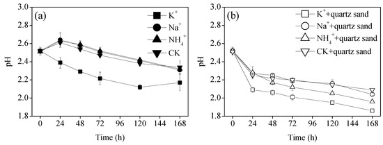 When the quartz sand was not added to the reaction system (Figure 2a), the pH variations were similar for the systems containing Na+, NH4+, and CK, where the pH values rose from 2.50 to 2.64, 2.63, and 2.61 at 24 h, then gradually decreased to 2.31, 2.32, and 2.34, respectively, after 168 h. Thus, it can be inferred that 53.3 mmol/L Na+ or NH4+ added individually exerted no effect on the biological mineralization process. In contrast, when 53.3 mmol/L K+ was added individually, the solution pH exhibited a downward trend, decreasing from 2.50 to 2.17. According to the biochemical reactions (Equations (1)–(3)) for secondary iron mineral formation, a lower pH promotes Fe3+ hydrolysis on the minerals. Bai et al. [32] also showed that, compared with Na+ or NH4+, K+ exhibited a stronger ability to induce mineralization in a 160 mmol/L Fe2+ solution containing A. ferrooxidans.