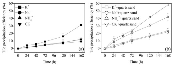 With the participation of various monovalent cations, changes in the TFe precipitation efficiency for systems with or without quartz sand are shown in Figure 3. For the separate additions of Na+, NH4+, and CK (Figure 3a), the TFe precipitation efficiencies were essentially identical. At 168 h, the TFe precipitation efficiencies were only 9.5%, 12.1%, and 12.6% after the mineralization reaction for the Na+, NH4+, and CK treatments, respectively. Separate additions of 53.3 mmol/L Na+ or NH4+ could not induce the mass removal of soluble Fe in simulated AMD. For the treatment involving K+ alone, the TFe precipitation efficiency was much higher than that of the CK treatment. This was beneficial for the mass synthesis of minerals, and the TFe precipitation efficiency increased from 12.6% to 31.5% after mineralization. The results of this study are consistent with those reported by Wang et al. [23], who reported that at K+ concentrations of 7.14, 16, 32, 53.3, and 80 mmol/L, the TFe precipitation efficiencies for biomineralization mediated by A. ferrooxidans were approximately 36%, 42%, 46%, 50%, and 52%, respectively. Since the addition of K+ did not accelerate the oxidation efficiency of Fe2+ (Figure 1), the increased TFe precipitation efficiency can be mainly attributed to the Fe3+ hydrolysis induced by K+.