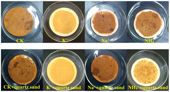 Photographs and XRD patterns of the secondary iron minerals collected for each biomineralization treatment are shown in Figure 4 and Figure 5, respectively. With reference to the standard (JCPDS) [35], XRD patterns of crystalline jarosite and amorphous schwertmannite, the data suggested that at 53.3 mmol/L monovalent cation concentration, treatments with K+, Na+, and NH4+ mediated by A. ferrooxidans produced K-jarosite, schwertmannite, and schwertmannite, respectively. This indicates that Na+ and NH4+ were not involved in the synthesis of Na-jarosite or NH4-jarosite, which is consistent with the results of Bai et al. [32]. However, after adding 40 g/L quartz sand to the NH4+ system, the secondary iron minerals exhibited diffraction peaks characteristics of schwertmannite and NH4-jarosite. Thus, 40 g/L quartz sand induced and promoted changes in the synthesis process of the secondary iron minerals, forming NH4-jarosite more easily than schwertmannite. However, the dominant mineral obtained from the Na+ and quartz sand process remained schwertmannite, which further confirmed that Na+ was not involved in the biosynthesis reaction of Na-jarosite. The same trends of the solution pH and TFe precipitation efficiency were observed for the treatments of Na+ and CK, whether quartz sand was added or not (Figure 2 and Figure 3). According to Equations (2) and (3), if the secondary iron minerals were produced by a single pathway, the yield of jarosite produced by the same amount of Fe3+ should be 1.5 times that of schwertmannite. The addition of quartz sand may lead to increased production of biogenerated secondary iron minerals. This process effectively removes soluble Fe in AMD, which is of great significance for the optimization of the bio-mineralization treatment of AMD.