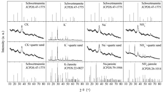 To remove soluble Fe from simulated AMD, biomineralization of each system, with and without the addition of 40 g/L quartz sand, was investigated with an initial Fe2+ concentration of 160 mmol/L and monovalent cations (K+, Na+, and NH4+) concentration of 53.3 mmol/L. The addition of quartz sand contributed to Fe3+ hydrolysis (the oxidation product of Fe2+), improving TFe removal efficiency in the simulated AMD. For example, the TFe removal efficiencies of the K+, Na+, and NH4+ systems rose from 31.5%, 9.5%, and 12.1% to 58.1%, 22.2%, and 42.3%, respectively, with the addition of quartz sand. The quartz sand shortened the induction period of the biomineralization reaction, improving the TFe precipitation efficiency of the simulated AMD during the initial stage. The XRD patterns showed that 40 g/L quartz sand can improve the biomineralization removal efficiency of soluble Fe in the simulated AMD and induce the Fe3+ biomineralization pathway from schwertmannite to jarosite. In the next step, we will continue to optimize the experimental method of this study and apply it to the treatment of real AMD to evaluate the feasibility of its practical application.