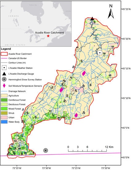 The climate is cold and humid, with warm summers (Dfb) (Köppen climate classification [60]). Based on hourly records from the L’Acadie weather station (Figure 1) available for the 1996–2019 period (Environment and Climate Change Canada, WMO ID 71372), the mean annual and cold season (November–April) air temperature was 7.2 and −3.9 °C, respectively, while the mean annual precipitation was 1030 mm. The hydrology of the Acadie River is driven by mixed rain and snow processes, resulting in two high flow events on a normal water year. The first high flow typically occurs in early spring following snowmelt, while the second is a rainfall-runoff event in late fall. The surficial geology of the upper catchment is mainly composed of stony tills due to the geographical proximity of the Adirondack Mountains, whereas the lower catchment is mostly composed of clayey and loamy soils formed from marine and fluvial deposits [57]. Organic soils formed from the gradual accumulation of organic matter are present across the catchment, and discontinuous glacial till is found below the marine and fluvial sediments [57]. Given the flat topography and poor drainage of soils (particularly clay), tile drainage is used extensively to remove excess water from the surface and rootzone. These subsurface tiles drain into a system of ditches, or surface canals, that are connected to the river network (Figure 1). The soil textures in the catchment are 40% clayey, 25% till deposits, 17% organic soil, 10% sandy, 4% loamy and 4% gravelly, which were acquired from Québec Research and Development Institute for the Agri-Environment (IRDA) at a 1:50,000 scale. The land use datasets were obtained from Québec Ministry of Forests, Wildlife and Parks (MFFP) and La Financière Agricole du Québec (FADQ) for both non-agricultural lands and cropping systems. While the main crop is soybeans (40%) followed by corn (34%) [57], different crop types such as vegetables (mainly potatoes and onions), wheat, barley and other cereal grains are also cultivated in the agricultural lands. A 1 × 1 m resolution LIDAR-based digital elevation model (DEM) was obtained from MFFP. The stream and open channel drainage networks were acquired from Québec Ministry of Energy and Natural Resources (MERN). Hourly air temperature, wind speed and relative humidity data within the catchment were acquired for the 1996–2019 period from the L’Acadie weather station (Figure 1) maintained by Environment and Climate Change Canada (ECCC). Gaps in the data were filled with data from four other ECCC weather stations (Ste-Clotilde, McTavish, St-Anne de Bellevue and Frelighsburg) located within a radius of 50 km from the geometric center of the study area. The 1.6% gaps were filled by a principal component analysis (PCA) with the expectation-maximization algorithm [61]. This method uses a cross-validation procedure prior to filling the missing data to detect the number of statistically significant empirical orthogonal functions (EOFs) used for reconstructing the missing data. The temperature was spatially distributed at the catchment based on an environmental lapse rate of 0.005 °C m−1 [62]. Hourly solar radiation was extracted for the L’Acadie weather station from the database of Hydro-Québec (available at https://www.simeb.ca:8443/index_fr.jsp). Daily total precipitation data were extracted from the 0.1° × 0.1° gridded climate data produced by the Québec Ministry of Sustainable Development, Environment, and Fight against Climate Change (MELCC). This dataset was created by spatially interpolating (kriging) quality-controlled observations of permanent weather stations from the Programme de Surveillance du Climat du Québec (PSC) and ECCC [62]. The main advantage of this dataset is its long coverage from 1961 to present. Bajamgnigni Gbambie et al. [63] compared the different gridded precipitation datasets and their implication for hydrological modelling in Québec and found that the MELCC data showed the best performance in catchments located on the south shore of the St. Lawrence River. Daily river discharge measured at the L’Acadie discharge gauge (Figure 1) were extracted from the database of Québec Center of Water Expertise (CEHQ) (www.cehq.qc.ca) for the 1996–2019 period. Observations of snow depth and density were obtained from the Hemmingford snow course station, located within a mixed forest patch a few kilometers away from the catchment (Figure 1). Snow surveys have been performed by the MELCC every two weeks during winter and spring since the 1980s, using 10 fixed points uniformly distributed along a 300 m transect representative of the surrounding landscape [64]. Snow depth is measured by probing with a snow tube at eight locations surrounding the fixed points and the results are averaged. Density is measured by weighting the snow tube sample taken at the center of the fixed point and the result is multiplied by the mean snow depth to estimate SWE at the point. Finally, the mean SWE at the site is obtained by averaging the SWE measured at the 10 points along the transect. Errors on site-averaged SWE are not reported, but federal snow tubes are known to overestimate SWE, typically by 0% to 11% [65]. Additional snow depth and density measurements were made for the winters of 2018 and 2019 along survey transects at agricultural and forest sites, where soil temperature/moisture probes were installed (Figure 1). SWE values were then averaged to represent landscape-scale SWE.