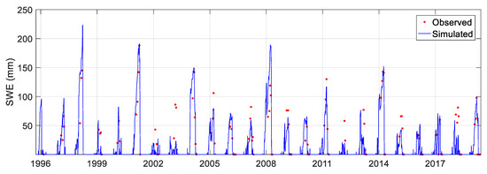Observed and simulated SWE at the Hemmingford snow survey station was compared for the 1996–2019 period (Figure 2). The Nash–Sutcliffe efficiency (NSE) is 0.57 over the 23-year simulation. The root mean square error (RMSE), correlation coefficient and mean percent bias (PBIAS) are 28 mm, 0.84 and −10% for the simulation period, respectively. SWE is mostly underestimated during low snowpack years, which is likely due to uncertainties in the gridded precipitation dataset, parameters selections and limitations of the snow model (SNOBAL) [80], which was originally developed to simulate deep snowpacks. Despite some discrepancies, these results are considered to be adequate for the purpose of this study.
