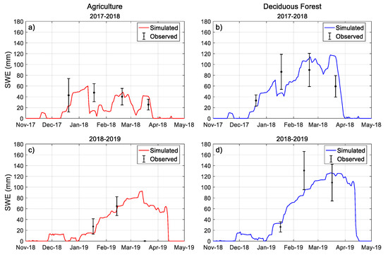 Comparisons of simulated and observed SWE for (a,c) agriculture and (b,d) deciduous forest for the winters of 2017–2018 and 2018–2019, respectively. Error bars represent the standard deviation of SWE.