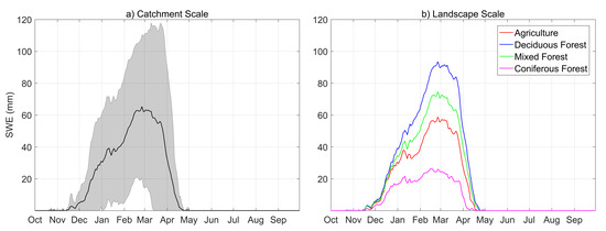SWE simulations at the (a) catchment and (b) landscape scale. The grey envelope in (a) illustrates the inter-annual variability for the 1996–2019 period.