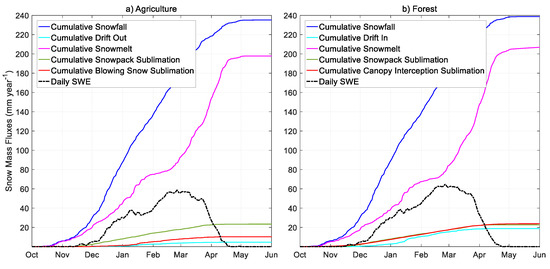 Average simulated cumulative snow mass fluxes and daily SWE between the years 1996 and 2019 in (a) agriculture (b) forest.
