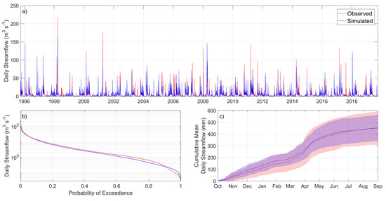 Assessment of the CRHM platform performance in simulating streamflow at the outlet of the Acadie River Catchment by comparing (a) daily streamflow, (b) flow duration curve, and (c) cumulative mean daily streamflow. The shades around the average values in panel (c) represent the inter-annual variability.