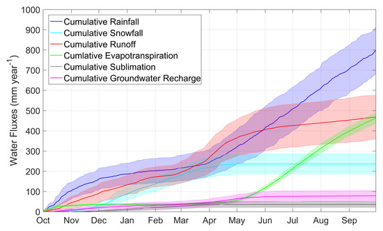 Average annual cumulative water fluxes at the catchment scale between the years 1996 and 2019. The shades around the average values represent the inter-annual variability (± standard deviation).