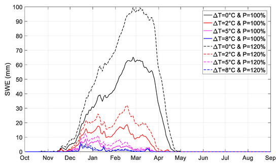 Along with the simulated decline in SCD and snowmelt, the mean snowmelt rate also exhibits a decline under all warming scenarios. However, it is important to note that the snowmelt rate under a 2 °C warming scenario with 20% increase in precipitation slightly increases compared to the reference period. In addition, all warming scenarios lead to more frequent mid-winter snowmelt events, resulting in several snow accumulation maxima during the snow season (Figure 8).