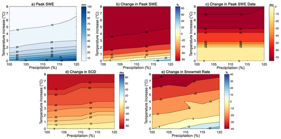 Climate sensitivity of snow metrics. (a) Annual peak SWE; (b) relative change in annual peak SWE; (c) change in annual peak SWE date—negative values represent a shift towards earlier dates; (d) change in snow cover duration (SCD); (e) relative change in the snowmelt rate.