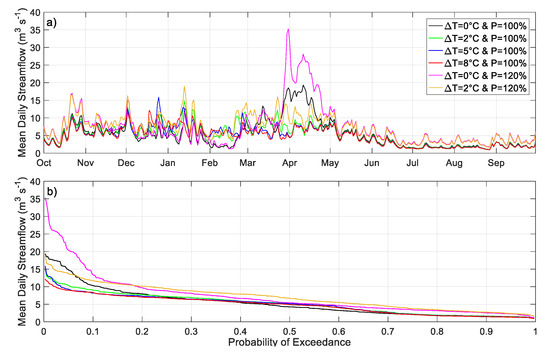 Changes in mean daily streamflow in response to selected warming and increasing precipitation scenarios. Changes in (a) mean daily streamflow, and (b) exceedance probability of mean daily streamflow.