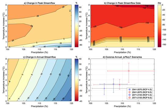 Climate sensitivity of streamflow in Acadie River. (a) Changes in annual peak daily discharge; (b) changes in annual peak daily discharge date; (c) changes in annual total discharge in response to temperature and precipitation changes; and (d) projected changes in annual temperature and precipitation for the periods 2041–2070 and 2071–2100 under a moderate emission scenario (RCP 4.5) and a high emission scenario (RCP 8.5) for Montérégie region of Québec [111].