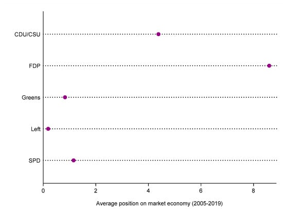 The greater a party’s score on this dimension, the higher its support for the free market. Figure 1 visualises the positioning of the parties on the free market by displaying their average score for the years 2005–2017, where 2017 corresponds to the last year for which data were available. We can infer from the figure that the party with the most pro-market position is the FDP, which makes it also the most right-wing party in economic terms, and the party with the least support for the market economy is The Left. However, the positions of the SPD and the Greens are only marginally different from that of The Left. Therefore, we consider this group of three parties—The Left, the Greens, and the SPD—to represent the left-wing parties in the German party system. The CDU/CSU holds a more positive attitude on the free market than the three previous parties, but less so compared to the FDP. Consequently, the CDU/CSU can be considered to have a moderate right-wing position on the free economy.