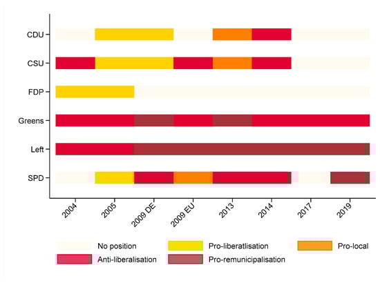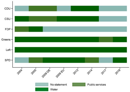 The assumption underlying this analysis is that political parties use specific words in their election manifestos in a purposeful manner in order to participate in party competition by means of offering positions on policy issues, selectively emphasising some policy issues, and engaging in framing policy issues []. Common approaches to generating data from election manifestos include the quantification of texts by enumerating the keywords appearing in them or by measuring the amount of space given to various issues []. For example, the widely used data from the Comparative Manifesto Project (CMP) and its successor, the Manifesto Research on Political Representation (MARPOR), are based on the statements of political parties in their election manifestos, which are coded in a standardised way by means of identifying ‘quasi-sentences’ that are relevant to a given policy domain []. While the CMP/MARPOR dataset is a very useful basis for analysis, the data are assigned to broad categories (e.g., ‘environmental protection’), which do not allow the positions of the individual parties on the liberalisation of water services to be assessed. Consequently, we had to generate our own dataset in order to answer our research questions based on qualitative content analysis [,,].