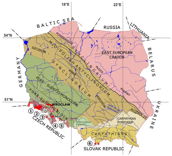 - Znosko, J. Map of tectonic units of Poland. In Tectonic atlas of Poland; Znosko, J., Ed.; Polish Geological Institute: Warsaw, Poland, 1998. [Google Scholar]