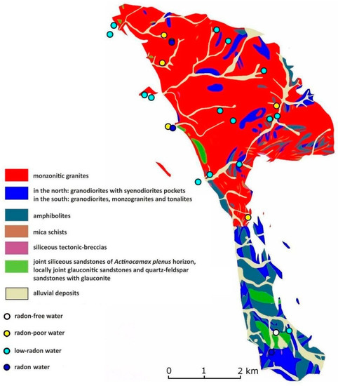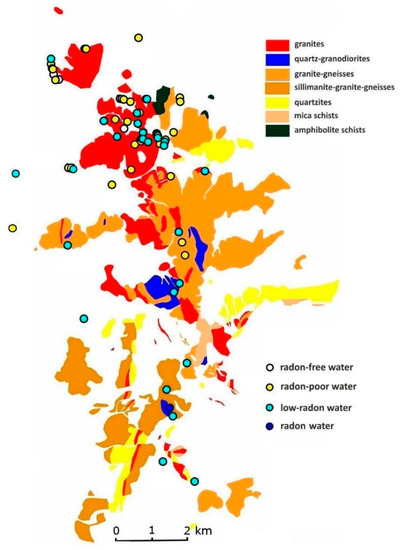 - Przylibski, T.A.; Gorecka, J. 222Rn activity concentration differences in groundwaters of three Variscan granitoid massifs in the Sudetes (NE Bohemian Massif, SW Poland). J. Environ. Radioact. 2014, 134, 43–53. [Google Scholar] [CrossRef]