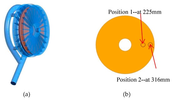The geometric model of numerical simulation was based on the structure of physical test, using Unigraphics NX commercial software for three-dimensional modeling. The calculation domain was established, to ensure the physical phenomena and scour behavior of multiphase flow is captured in the simulations. The overall flow channel of the rotating disc is shown in Figure 4a. The surface of rotating disc, the side facing the particle incident direction, is shown in Figure 4b. Two stainless steel samples were positioned from the disc origin at 225 mm (Position 1) and 316 mm (Position 2). The structure of the numerical simulation model was divided into box shell, front baffle, rotating disc surface, rear baffle, and annular outlet pipe. There were 24 cascades evenly distributed in the front and rear baffles. The outer diameter of the disc was 360 mm, and the diameter of the circular surface of the water inlet was 32 mm.