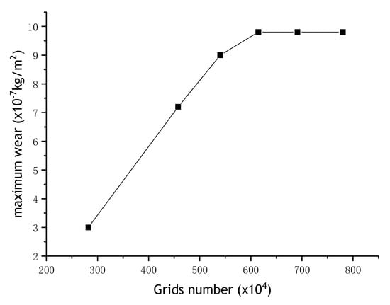 An unstructured tetrahedron mesh was divided in the whole rotating disc model by using the ICEM CFD software. The grid independence was verified with the values of the maximum erosion wear. Figure 5 shows that when the number of grids reaches 6.147 million, the maximum wear tends to be stable. Therefore, the total number of grids of 6.147 million was chosen. Figure 6 illustrates the divided grids of the model.