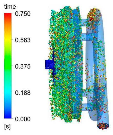 In order to understand how wear is developed on the test sample, the corresponding study (condition 1) of the rotating surface was chosen to analyze the movement of the particle, the erosion distribution, and the wear dependence with radius. Based on the movement simulation (Figure 7), the particles initially enter the rotating disc from the inlet, but then collide and reflect due to front and rear baffle plates and the rotating disc surface. Thereafter, they are discharged along with the water.