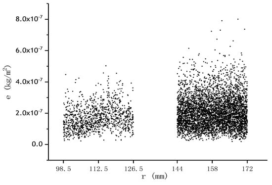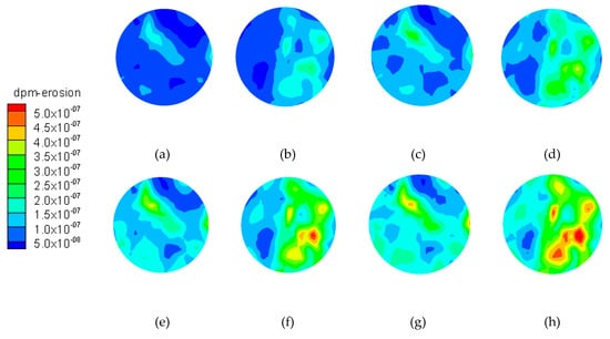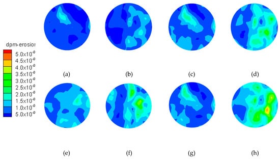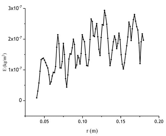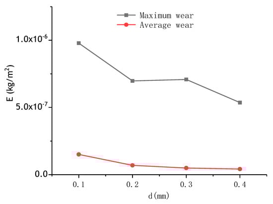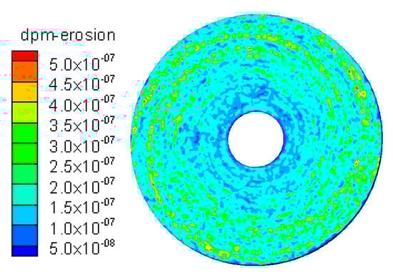 To illustrate the erosion depth, a cloud chart of the wear on the surface of the rotating disc was obtained, as shown in Figure 8. Clearly, the wear occurs in the shape of spots and the wear amount E (E, the weight loss of the disc after the numerical simulation) increases in a chaotic shape along the radius path, as a result of particles trailing the water flow (Figure 9).