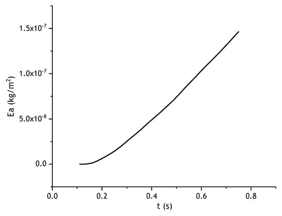 Figure 10 shows the change curve of average wear amount Ea with time. It can be seen that initially (0–0.2 s), prior to particles arriving at the disc surface, the average wear on the disc surface is basically 0, but then this increases exponentially with time. Since the wear is a time-accumulating process, the longer the particles act on the disc, the greater the average wear of the disc.