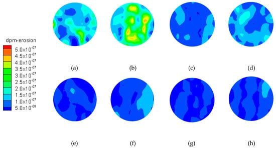 Wear contours of test samples at different particle inlet velocities: (a) condition set 9, 225 mm; (b) condition set 9,316 mm; (c) condition set 10, 225 mm; (d) condition set 10, 316 mm; (e) condition set 11, 225 mm; (f) condition set 11, 316 mm; (g) condition set 12, 225 mm; (h) condition set 12, 316 mm.
