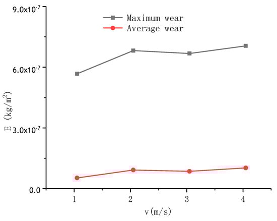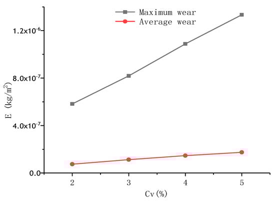 The simulations did detect evidence of a positive correlation between particle volume fraction (working conditions 5, 6, 7, 8) and area and degree of wear. Importantly, the wear of the surface tends to increase in the right portion of sample with D = 316, just as observed in Figure 14. Seen from Figure 15, the maximum and average wear increase linearly with the particle volume fraction, represented by Em = 2.4 × 10−7Cv + 10−7 and Ea = 3.17 × 10−8Cv + 1.16 × 10−8. This is because a larger volume fraction number results in a higher number of particles and collisions between particles and samples.