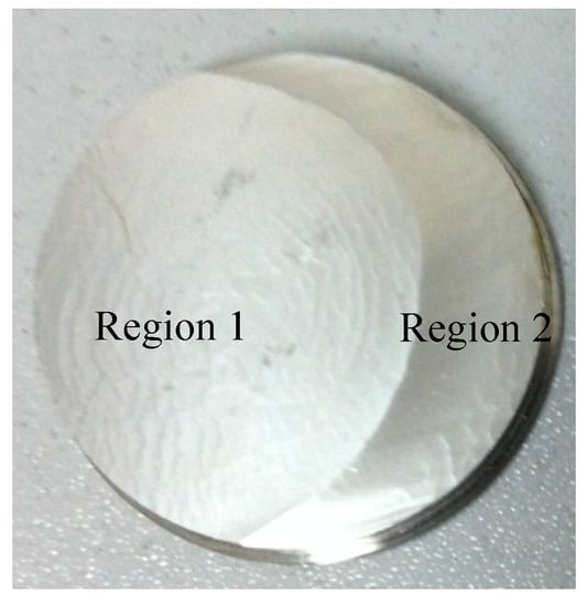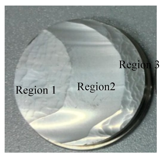 A comparison of the wear contours of both samples (Figure 12a,b) reveals the erosion level is irregular and more concentrated in the right-hand side of the disc, and this becomes more apparent with the increase of diameter. These results are in line with the experiments (Figure 18 and Figure 19). The Region 1 (least worn) of both samples may be compared with the blue area of Figure 12a, whilst Region 2 with the yellow section of Figure 12b. Both numerical simulation and experiments show that the wear was positively correlated with the linear velocity of the sample. Therefore, the worn surface was more apparent in the larger than smaller diameter test sample.