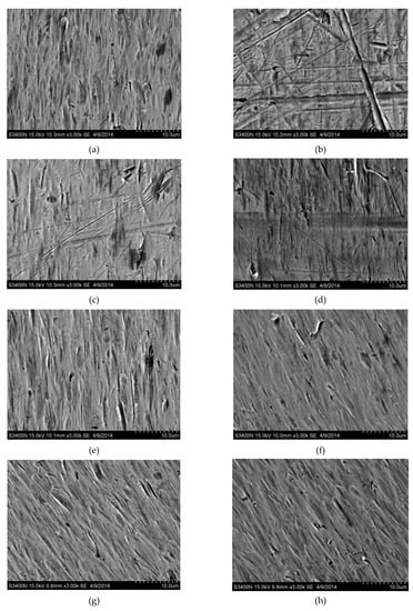 Wear contours of test samples with different particle volume fraction:(a) condition set 5, 225 mm; (b) condition set 5, 316 mm; (c) condition set 6, 225 mm; (d) condition set 6, 316 mm; (e) condition set 7, 225 mm; (f) condition set 7, 316 mm; (g) condition set 8, 225 mm; (h) condition set 8, 316 mm.