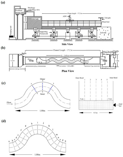Previous studies have testified the morphological changes in a sinuous channel [13,14,15]. In sinuous channel, the shifting of centerline and migration of sediment is a continuous process. Experiments conducted with erodible beds in a meandering channel have reported bed formations as point bars, mid-channel bars, free bars, and sand bars [16,17,18,19]. Xu and Bai [12] in their experiments with erodible bed and fixed walls, observed depositional bars at the inner bank and pools at the outer bank. Zhang et al. [20] observed the flood events in a step-pool channel. Scour appeared in the pool at threshold condition, and after which the scour depth increased linearly until the step collapsed. Riverbanks are vulnerable to erosion, and recent studies have been done in riverbanks of Langat River in Malaysia [21] and Parlung Tsangpo River in China [22]. Under natural conditions in rivers, the flow turbulence governs the bed deformation and channel migration [23]. Small-scale physical models of sinuous channels were prepared successfully in the laboratory [24,25,26,27], although it is very challenging to simulate a dynamic realistic sinuous channel. However, to find a solution to a specific problem to understand the fundamentals of river processes, experimental channels are quite useful to explore the mechanisms associated. In this study, scale effects were neglected, and a laboratory study was conducted to assess flow turbulence effects.